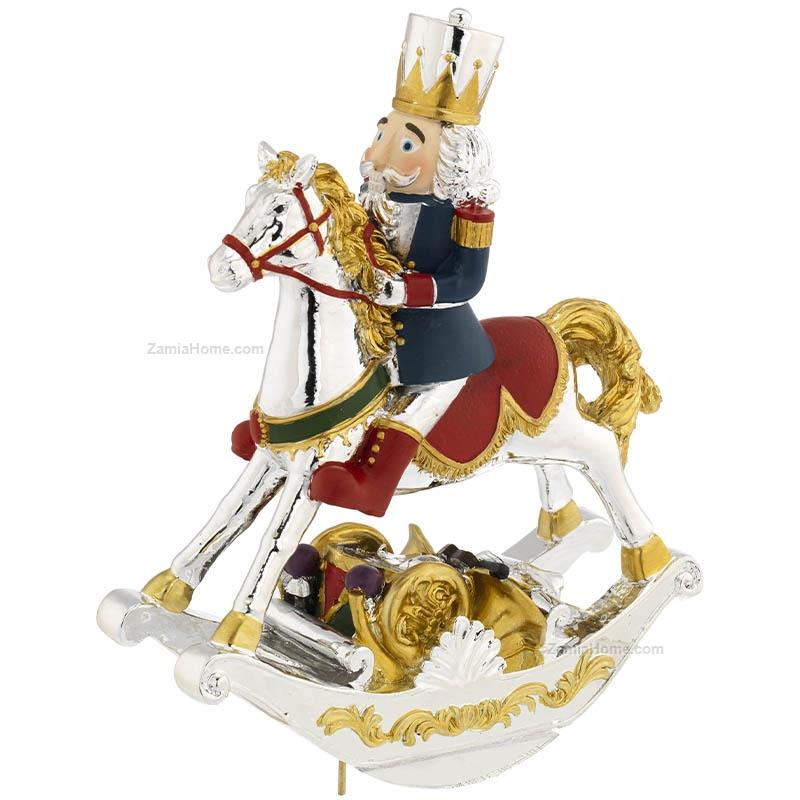 Soldatino schiaccianoci su cavallo a dondolo in resina argentata e dipinta, con carillon. Resine argentate natale 2025 h cm 19 - blu