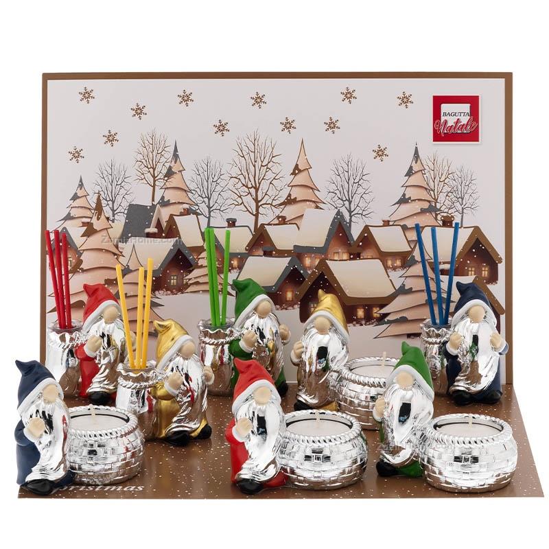 Decorated resin xmas gnomes, 8 pieces with exhibition stand. Silver coated items christmas 2025 expokit - 8 pcsBrand: Bagutta . Cod. prodotto: bank8628/29