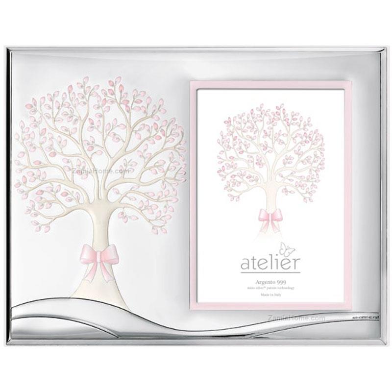 Silver plate photoframe "tree of life", white wood back. Baby line picture frames babyhood cm 9x13 - pink